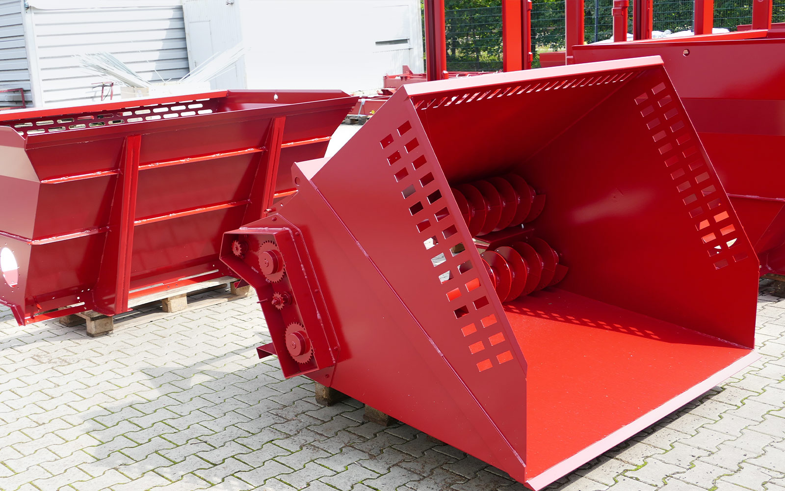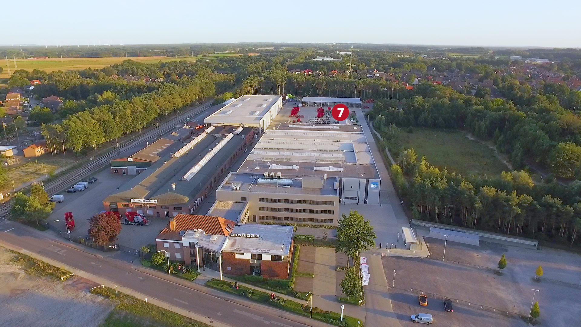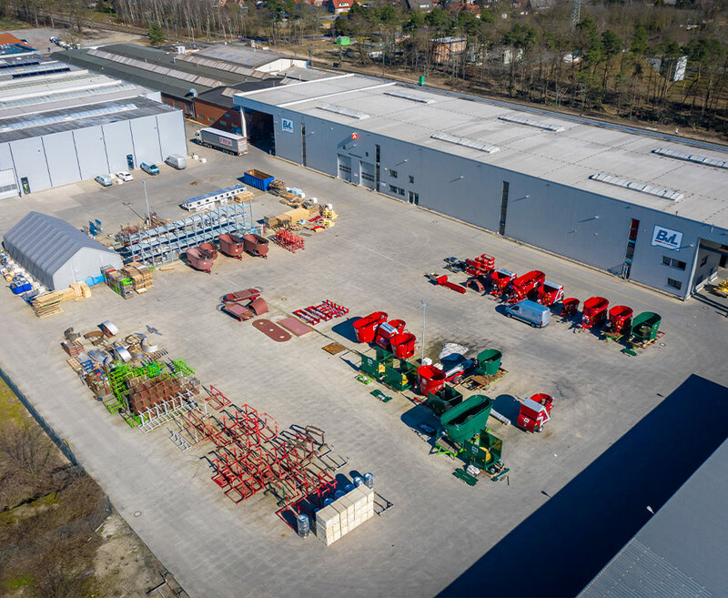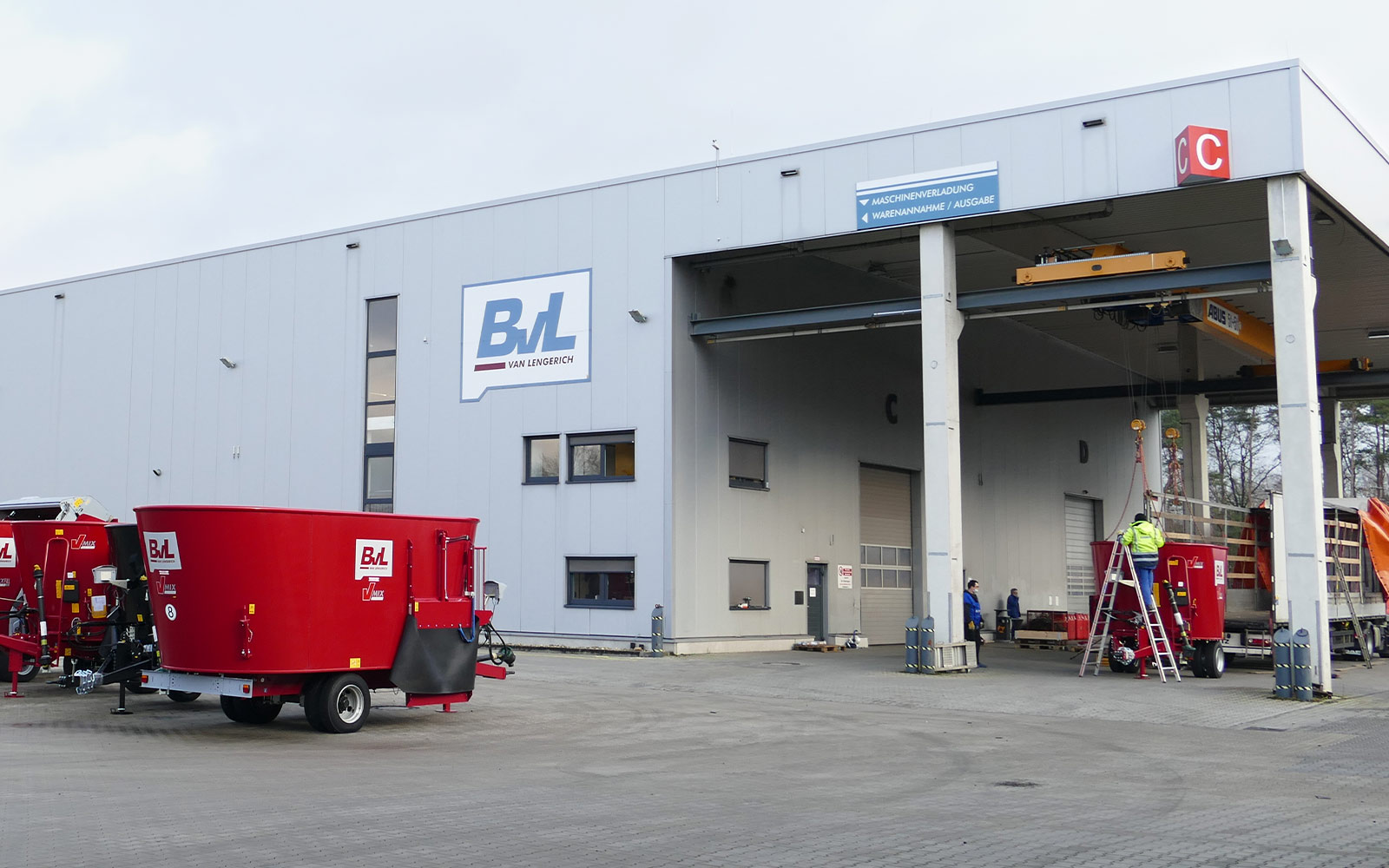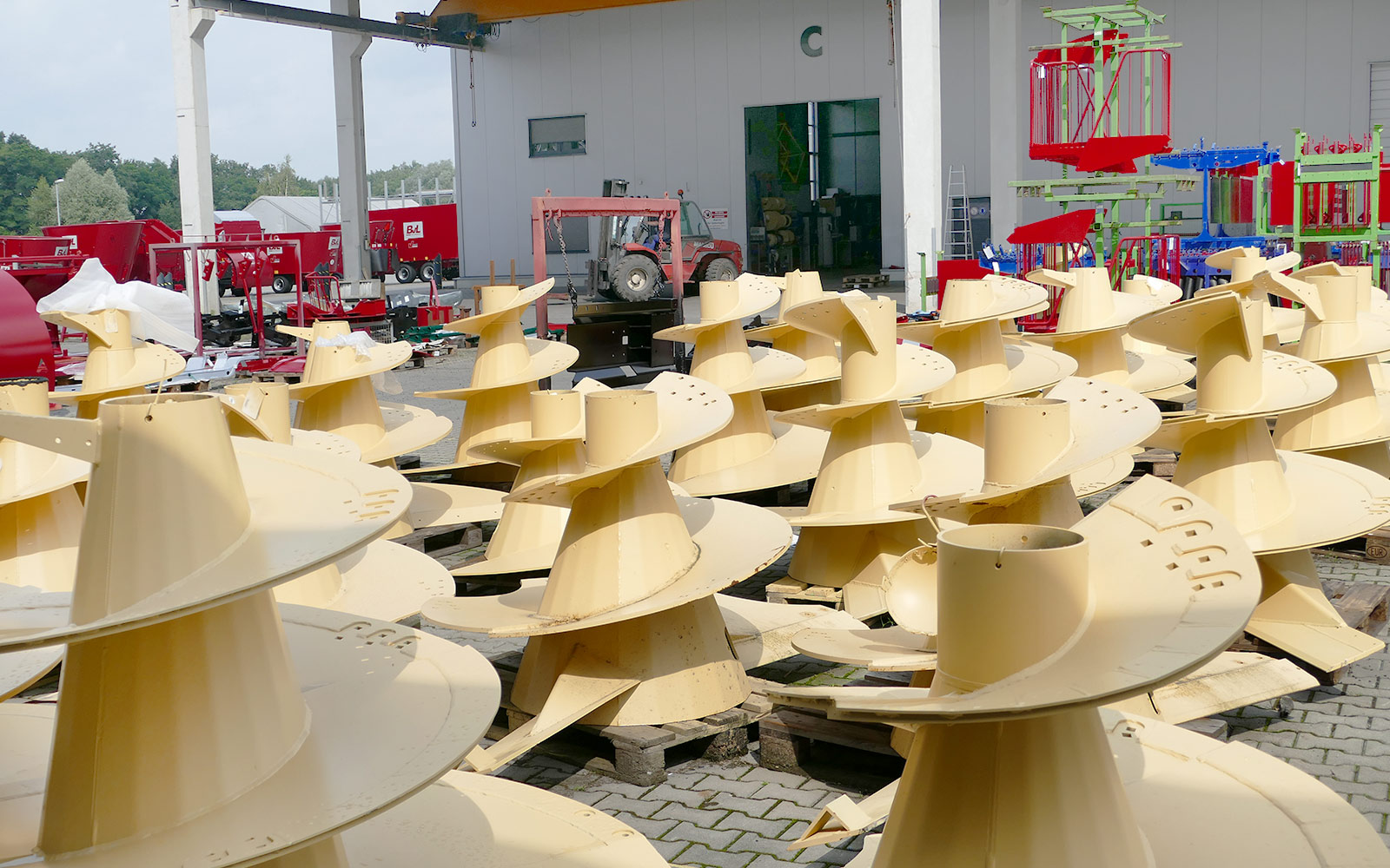 Nach der Endmontage werden die fertigen Maschinen bis zu Ihrem Transport auf der Lagerfläche zwischengelagert. Durch den auftragsbezogenen Bau der Maschinen ist diese Lagerung relativ kurz. Auch andere Teile der Maschinen werden hier im Rahmen der Produktion zwischengelagert.